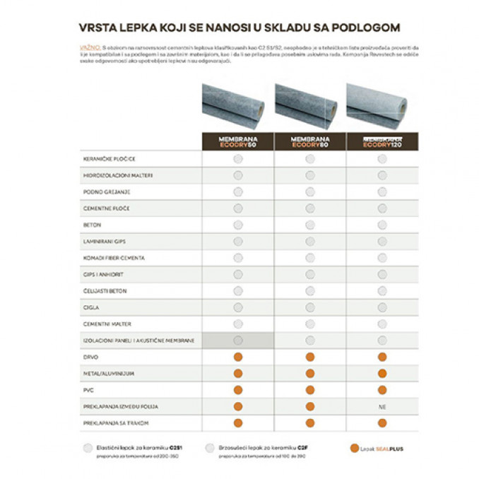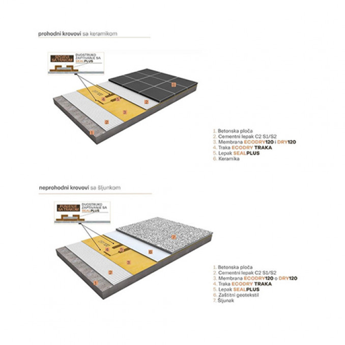 Revestech DRY 120 je visokoperformansna hidroizolaciona membrana namijenjena zaštiti terasa, krovova, balkona I bazena. Proizvedena od EVA kopolimera i ojačana poliester i polipropilen vlaknima, omogućava optimalno prijanjanje cementnog lijepka klase C2 S1/S2 tokom instalacije. Njena dvostruka zaštita i otpornost na vlagu garantuju dugotrajnu hidroizolaciju bez dodatnih slojeva.