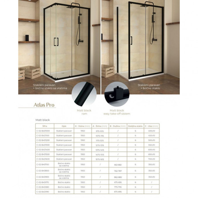 Tuš kabina ATLAS PRO mat crna, dimenzija 120x90 cm predstavlja idealno rešenje za moderno i funkcionalno kupatilo. Izrađena od kvalitetnog kaljenog stakla debljine 6 mm, ova kabina pruža dugotrajnost i sigurnost u svakodnevnoj upotrebi. Providno staklo doprinosi osećaju prostranosti i osvetljenosti, dok mat crni aluminijumski ram dodaje sofisticiran i elegantan izgled koji se lako uklapa u različite stilove enterijera.