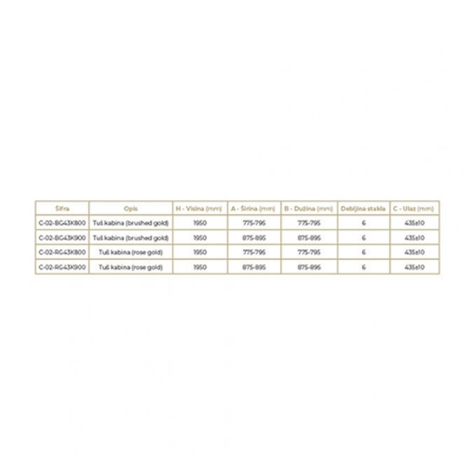 Kabina je izrađena od 6 mm debelog kaljenog providnog stakla, koje osigurava dugotrajnost, sigurnost i otpornost na udarce. Okvir u ružičasto-zlatnoj nijansi izrađen je od kvalitetnog aluminijuma otpornog na koroziju, što garantuje dug vijek trajanja i besprekornu estetiku.