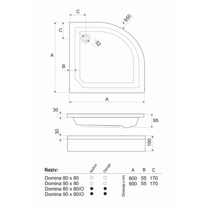 Tuš kada Luna je polukružna kadica izrađena od livenog sanitar-akrila ojačanog armiranim poliesterom. Može se ugraditi sa nogicama i oblogom, podzidati ili obložiti keramičkim pločicama, a moguće je i ugradnja u košuljicu (uz odgovarajuću debljinu).