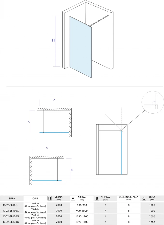 Walk-in COPEN MONTE DARK 90x200cm crni mat ram 8mm grey staklo